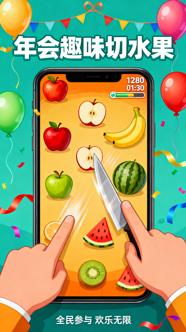 年会还在玩老套的抢凳子?「年会切水果」把经典"水果忍者"搬上巨幕!员工手机化作武士刀,手指一划,大屏水果瞬间爆裂,果汁四溅特效+刀剑破空音效,让沉闷的年会秒变解压修罗场!